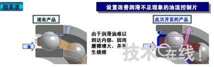 以往的球軸承有一個(gè)缺點(diǎn),即離心力導(dǎo)致潤(rùn)滑油流向外環(huán),影響到最需要潤(rùn)滑的內(nèi)環(huán)與滾珠之間的潤(rùn)滑性能。為此,該公司在改變保持架形狀的同時(shí),采用了在軸承潤(rùn)滑油供給口部分設(shè)置樹脂片、將油導(dǎo)向內(nèi)環(huán)側(cè)的結(jié)構(gòu)。由此可保證向內(nèi)環(huán)穩(wěn)定供油,減少磨擦導(dǎo)致的發(fā)熱。