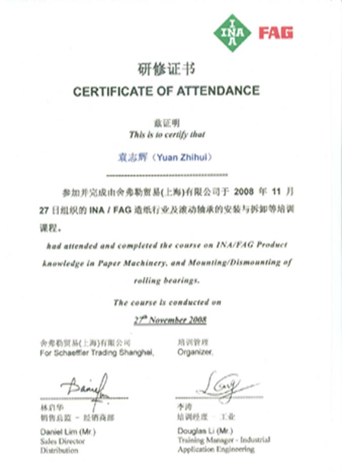舍弗勒貿(mào)易(上海)有限公司于2008年11月27日組織了INA/FAG造紙行業(yè)及滾動軸承的安裝與拆卸等培訓(xùn)課程,麒麟機(jī)械有限公司共有10位銷售人員出席培訓(xùn)課程,并取得了研修證書。