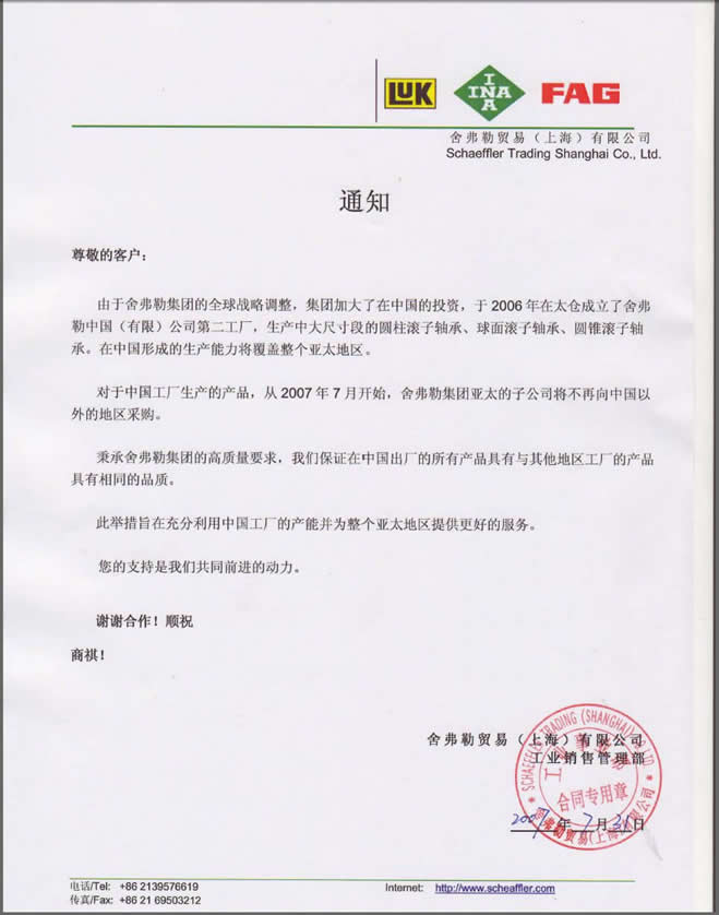 關(guān)于舍弗勒(SCHAEFFLER)中國產(chǎn)品產(chǎn)地說明