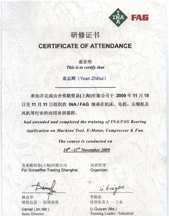 舍弗勒集團(tuán)中國區(qū)2009年南方區(qū)第二期經(jīng)銷商專項(xiàng)應(yīng)用領(lǐng)域主題培訓(xùn)于11月10至11日在廣州市天河區(qū)崗頂僑鑫教育學(xué)院進(jìn)行,麒麟機(jī)械有限公司共有7位管理、銷售人員出席本培訓(xùn)課程,并取得了研修證書。